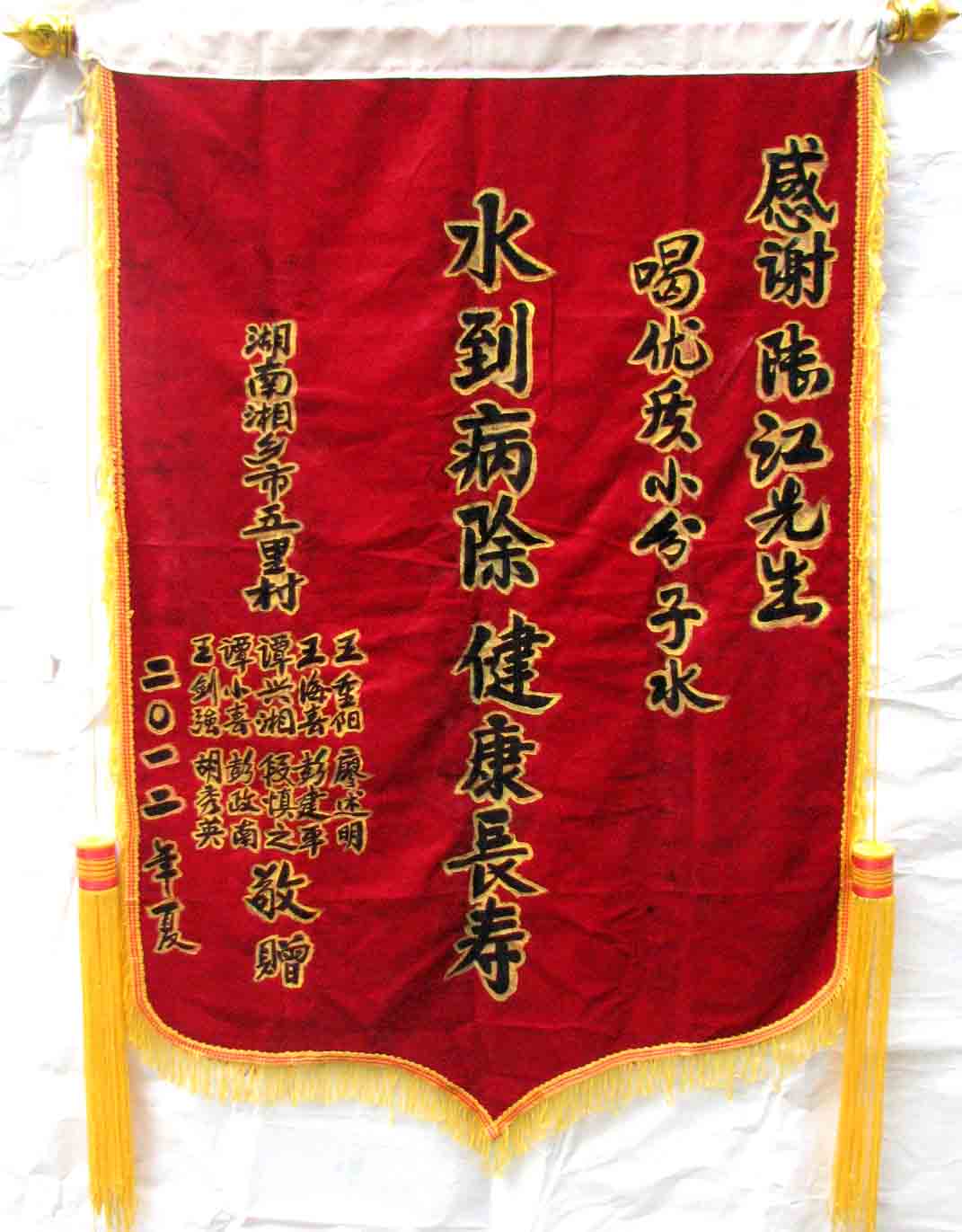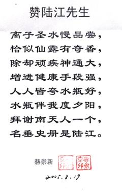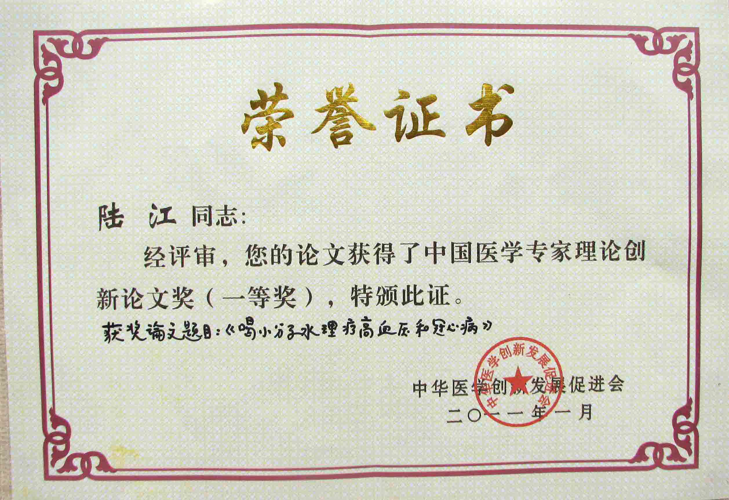 新疆63歲的賀兆生飲用一年,冠心病未愈,他用電話介紹是食堂管理員,問他食量多少?說(shuō)吃七八分飽,睡前還吃兩袋牛奶,陸 江說(shuō)我在論文和書中多次批判“吃七八分飽”,關(guān)照患者務(wù)必用“己饑方食”控制主食肉食量,要他把牛奶改在早中餐吃,減少主食肉食量,建議不吃晩餐,晚上只吃一個(gè)蘋果,再經(jīng)幾個(gè)月補(bǔ)水節(jié)食,治愈了21年的冠心病和肥胖、失眠等病,信中由衷地感激陸 江為再生父母。[13]因?yàn)獒t(yī)生從未過(guò)問他的膳食習(xí)慣,只管開處方藥或手術(shù),父母也不會(huì)叫他不吃晩飯。