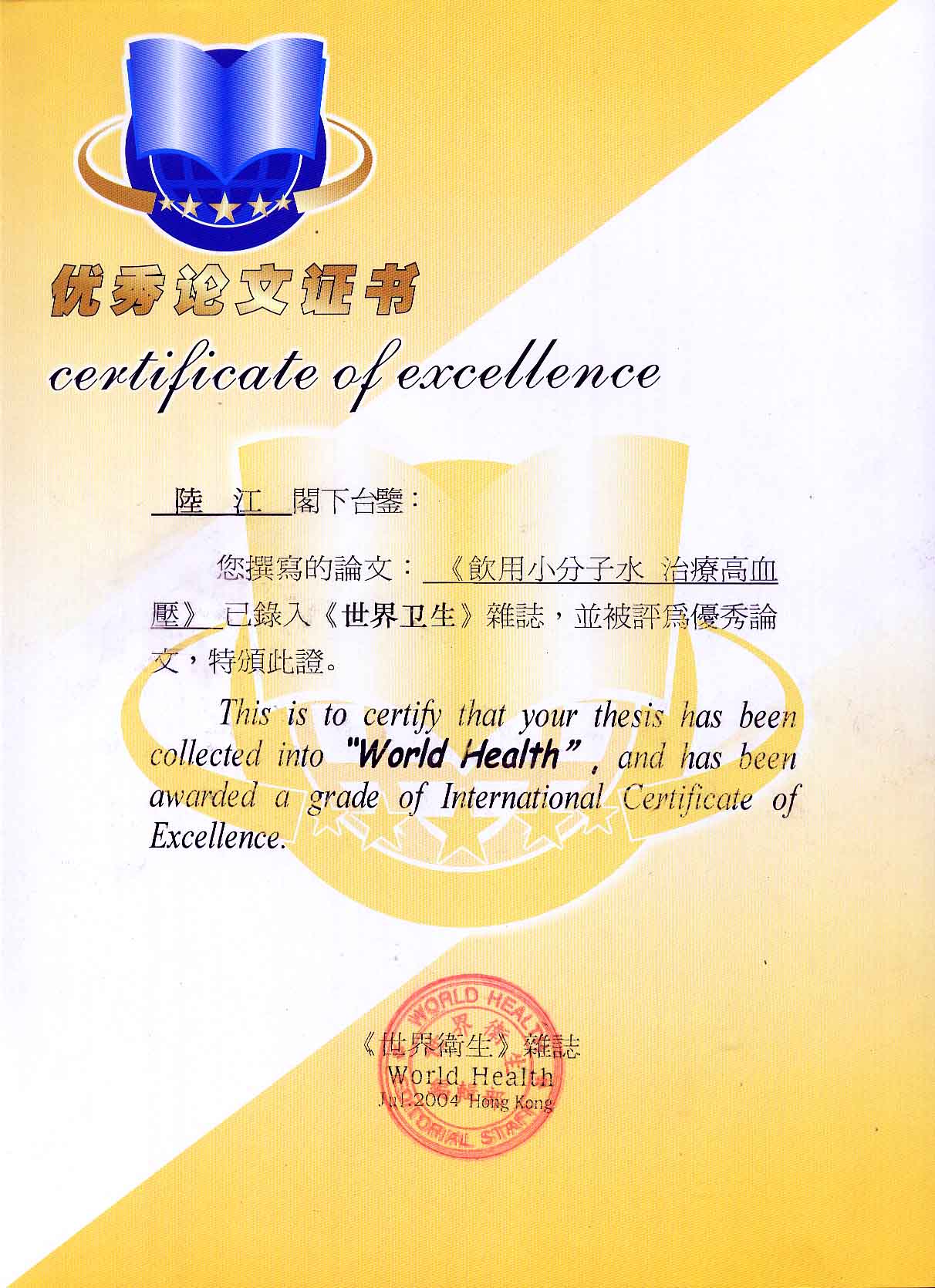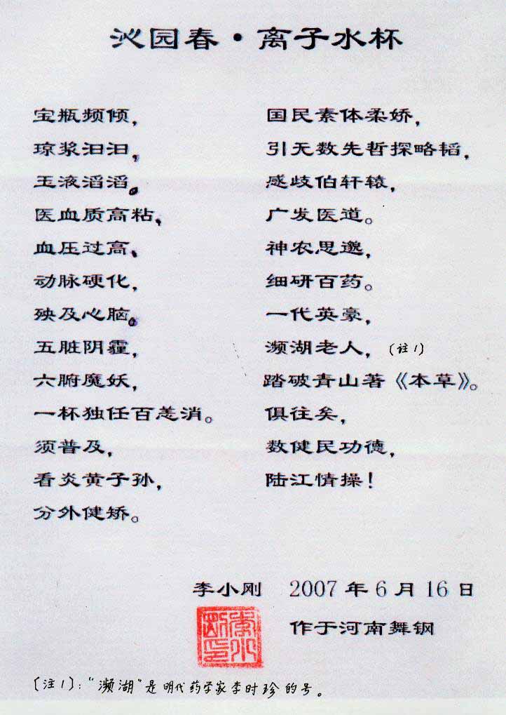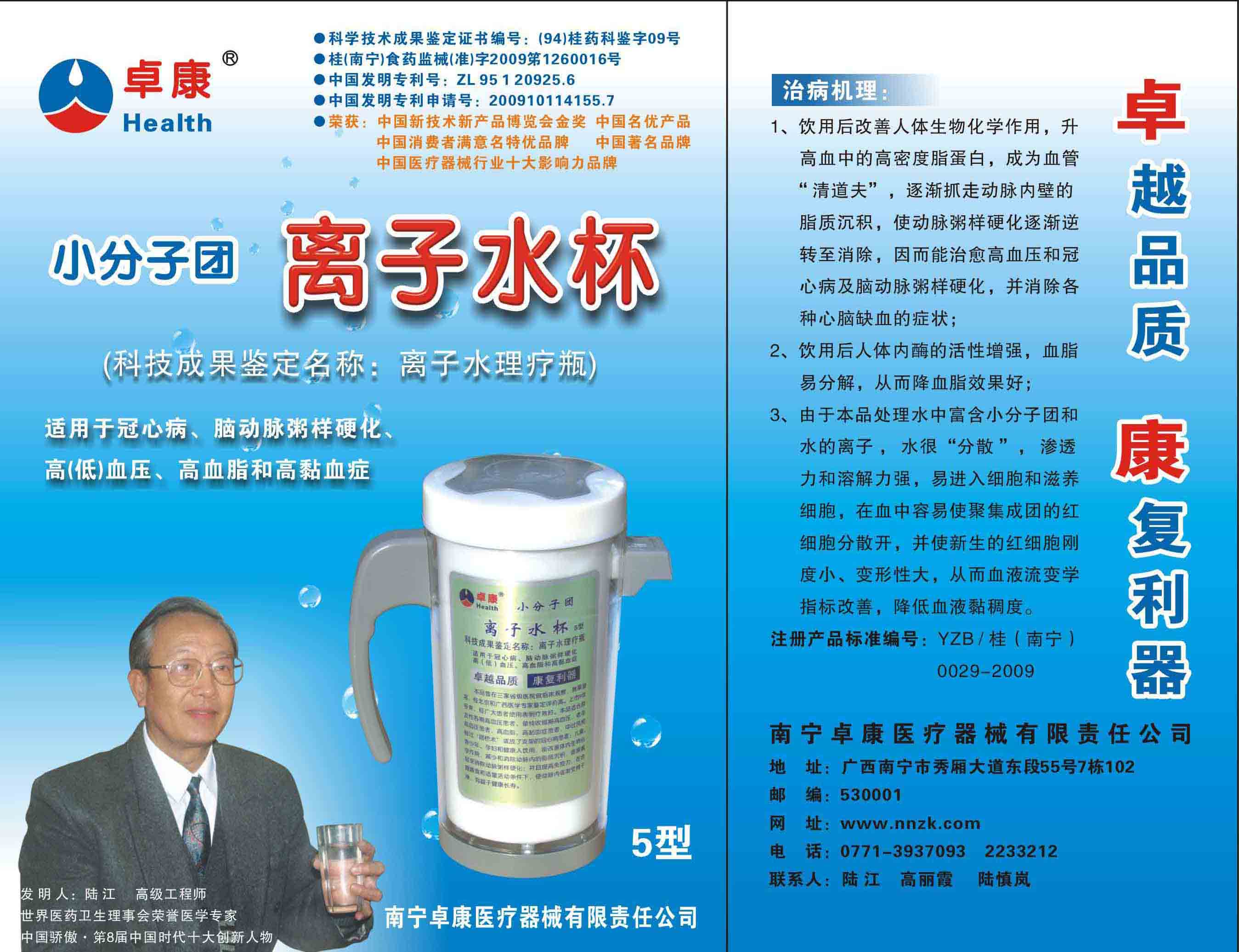 -----我是從事建筑的高工,本來(lái)沒有資格去攻克醫(yī)學(xué)難題,卻為了自身健康才扣響醫(yī)學(xué)的大門。由于我1990年患高血壓,因怕中風(fēng)才研究發(fā)明了離子水瓶,我把水處理成微小分子團(tuán)水,飲用后治愈了高血壓。便于1993年底送到三家省級(jí)醫(yī)院做臨床試用4個(gè)月。經(jīng)北京和廣西醫(yī)學(xué)專家鑒定:"降脂降壓效果好"," 能擴(kuò)大心腦動(dòng)脈流量,改善心腦電圖以及微循環(huán)","對(duì)治療心腦動(dòng)脈粥樣硬化、高血壓、高血脂有良好的醫(yī)療保健作用。""產(chǎn)品的技術(shù)性能和療效達(dá)到了同類產(chǎn)品的國(guó)內(nèi)領(lǐng)先水平,經(jīng)廣西醫(yī)學(xué)科學(xué)情報(bào)研究所檢索,未見國(guó)外有類似報(bào)道。"中國(guó)醫(yī)學(xué)科學(xué)院張正國(guó)教授從美國(guó)國(guó)立醫(yī)學(xué)圖書館數(shù)據(jù)庫(kù)存Medline檢索英俄文資料,均未見類似報(bào)告。2000年上市后,我為了對(duì)消費(fèi)者負(fù)責(zé)而繼續(xù)觀察研究,一直通過(guò)《信譽(yù)卡》和《質(zhì)量跟蹤調(diào)查書》向患者承諾療效,請(qǐng)用戶使用6個(gè)月后反饋效果。和脂壓患者飲用2至5個(gè)月內(nèi),消除癥狀,停服藥物,血壓正常;冠心病患者飲用3~5個(gè)月逐漸減輕至消除心絞痛、房顫等癥狀,不再服藥,飲用1年左右心電圖正常,經(jīng)冠脈造影掃描無(wú)明顯狹窄,表明冠心病痊愈。大量患者還反映許多衰弱器官被修復(fù),讓前列腺增生、慢性咽喉炎、慢性氣管炎、支氣管炎、慢性胃炎、腸炎和膽囊炎等不藥而愈;2型糖尿病患者是因?yàn)橐葝u衰弱致病,飲用該水半年至一年,逐漸減藥至停藥,血糖尿糖正常,真正治愈2型糖尿病。中風(fēng)后遺癥患者飲用六七個(gè)月,可逐漸減輕至消除肢體和語(yǔ)言障礙,表明飲用該水能讓壽命很長(zhǎng)的神經(jīng)元細(xì)胞逐漸修復(fù),奇跡般地恢復(fù)肢體和語(yǔ)言功能。飲用后還使胸腺和脾臟兩個(gè)重要的免疫器官被修復(fù)和增強(qiáng),產(chǎn)生免疫細(xì)胞多,提高了免疫力,使人不生病或少生病。自此, 飲用微小分子團(tuán)水創(chuàng)造了攻克冠心病、高(低)血壓和糖尿病三大醫(yī)學(xué)難題的奇跡。人們對(duì)此感到不可思議,但實(shí)踐是檢驗(yàn)真理的唯一標(biāo)準(zhǔn)。