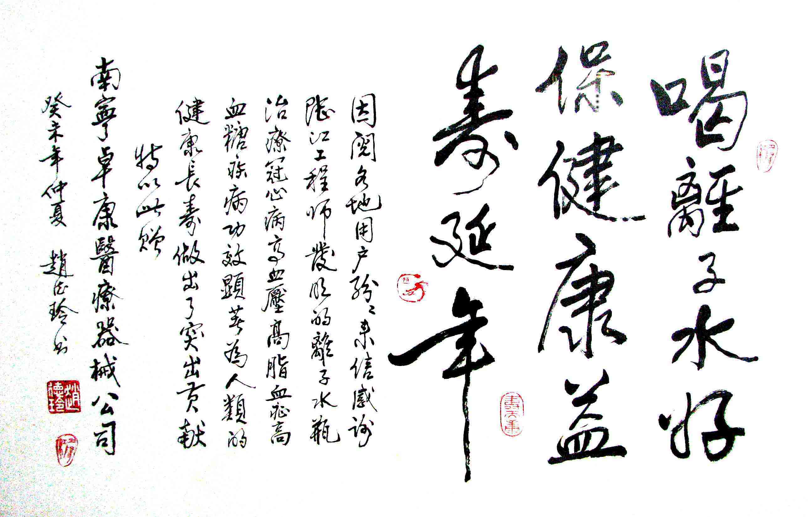 本品大量用戶的使用效果表明,能治愈冠心病、腦動(dòng)脈硬化、原發(fā)性高(低)血壓、高血脂、高粘血癥、高血尿酸癥(痛風(fēng))和2型糖尿病、衰弱器官并發(fā)癥(前列腺增生、腎衰與尿毒癥)及中風(fēng)后遺癥等療效好。產(chǎn)品配信譽(yù)卡。使用壽命30年,不換芯,易清洗。團(tuán)購(gòu)優(yōu)惠。從郵局匯款,匯費(fèi)1%,地址按本頁(yè)下方地址、聯(lián)系人寫。從銀行匯款,請(qǐng)點(diǎn)擊[聯(lián)系匯款]欄,從工商銀行匯款,建設(shè)銀行、農(nóng)業(yè)銀行匯款,均免收匯費(fèi),匯款后20--30分鐘內(nèi)發(fā)短信,可用微信轉(zhuǎn)帳,均免匯費(fèi),微信號(hào)即手機(jī)號(hào)13768308380。匯款后,告知你的姓名和地址,我公司聯(lián)系人手機(jī)號(hào)是:13768308380。卓康牌離子水瓶為我公司獨(dú)家生產(chǎn),郵購(gòu)產(chǎn)品配《補(bǔ)水的大智慧》彩印書一本,另配四季出版社出版的新書《補(bǔ)水的大智慧》一本,并配光盤一張(含央視主持人釆訪陸江的對(duì)話視頻)。目前市場(chǎng)和"淘寶網(wǎng)"上有人兜售假冒的偽品,望讀者審察辯別真?zhèn)?,造假者剽竊假冒本公司的各種認(rèn)證、獲獎(jiǎng)獎(jiǎng)項(xiàng)、專利號(hào)和外包裝盒上的中英文字,包括科技成果的鑒定意見等,請(qǐng)讀者注意防偽。如何識(shí)別假貨?已經(jīng)買了假貨怎么辦?(請(qǐng)點(diǎn)擊[打假掠影][打假掠影])。