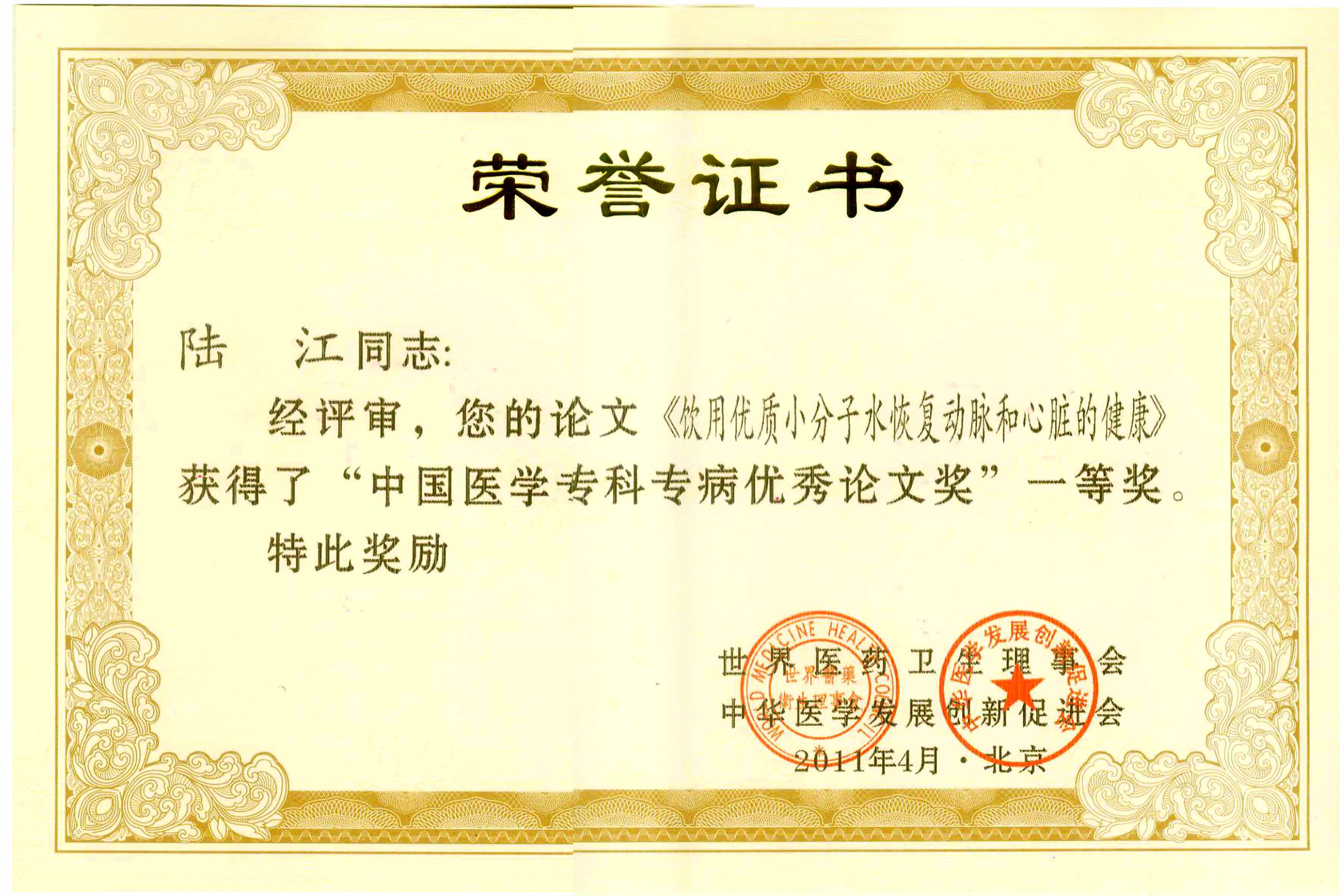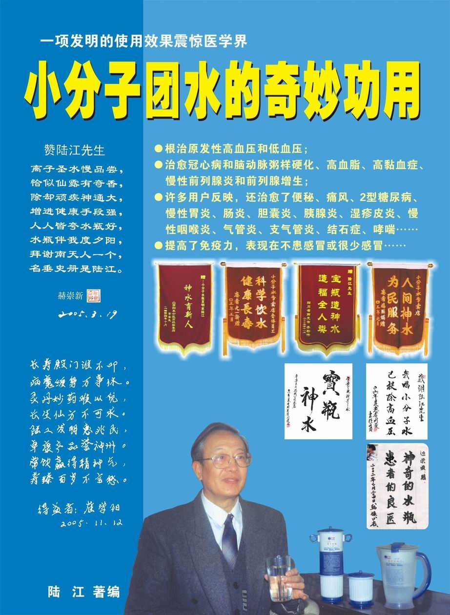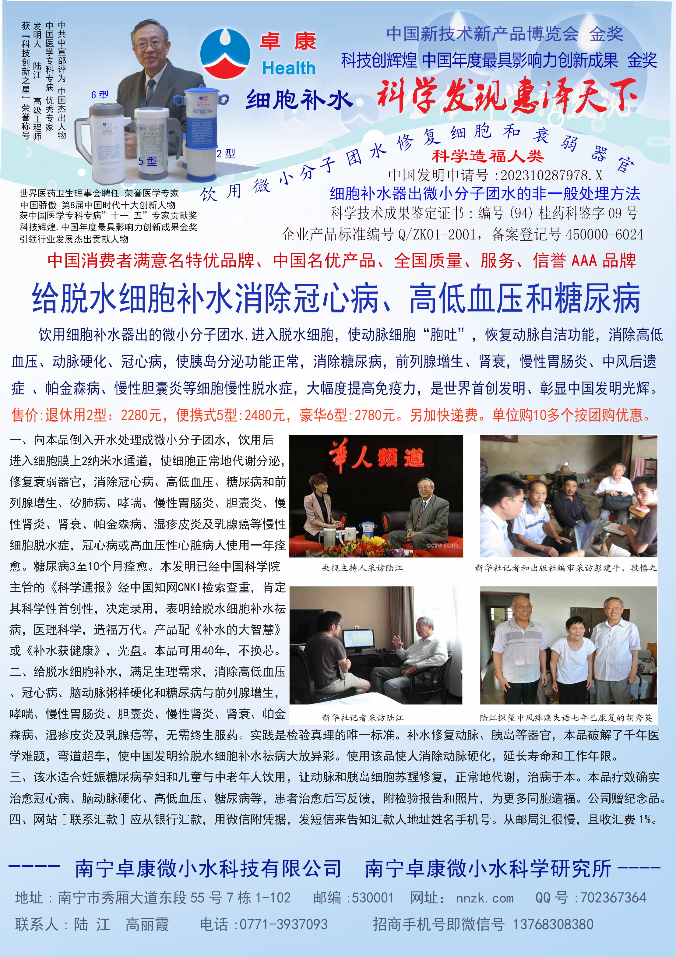 人類幾千年來(lái)患以上病癥需終生服藥,幾十年也不能治愈??墒俏覈?guó)南寧的高級(jí)工程師陸 江,于1990年想根治高血壓,研究發(fā)明了離子水瓶,處理出微小分子團(tuán)水供飲用,經(jīng)過(guò)醫(yī)院臨床試用和專家鑒定,1999年獲中國(guó)發(fā)明專利權(quán),產(chǎn)品于2000年投放市場(chǎng)后一直跟蹤調(diào)查,據(jù)全國(guó)各地用戶反饋:祛除了高低血壓、糖尿病和冠心病,并使前列腺增生、咽喉炎、鼻竇炎、慢性氣管炎、支氣管炎、矽肺病、哮喘、慢性胃炎、腸炎、慢性膽囊炎、慢性腎炎、腎衰、膀胱炎、便秘、痔瘡、風(fēng)濕性關(guān)節(jié)炎和濕疹皮炎及中風(fēng)后遺癥等病癥不藥而愈。為什么喝微小水能治20多種???陸 江從1991年德國(guó)科學(xué)家發(fā)現(xiàn)細(xì)胞膜水通道僅為2納米獲得啟發(fā),認(rèn)為多種器官患病是因細(xì)胞脫水,不能正常代謝和分裂增殖,才使器官細(xì)胞減少致衰弱萎縮而形成細(xì)胞缺水性病癥。22年來(lái)的實(shí)踐有力地支持了“細(xì)胞脫水致病”這一重要論點(diǎn),表明喝微小水可滿足細(xì)胞的生理需求,補(bǔ)水就能祛病,是生命科學(xué)新亮點(diǎn)。